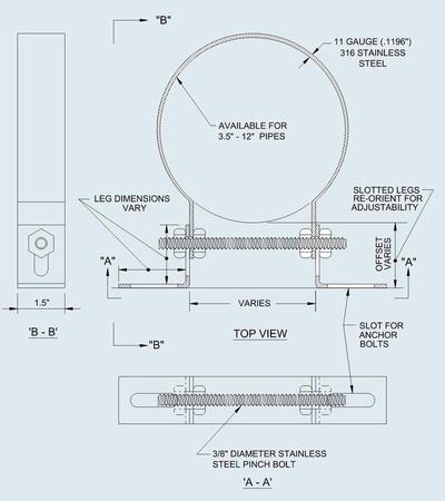 316 SS Pipe Bracket for 4'' pipe. Fits SDR 35 - Fits also 3.5 Sch 40 and 3'' C900 |