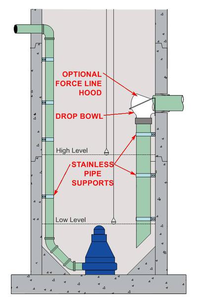 Wet Well inside drop with optional Force Line Hood.  Any length of drop can be accommodated.